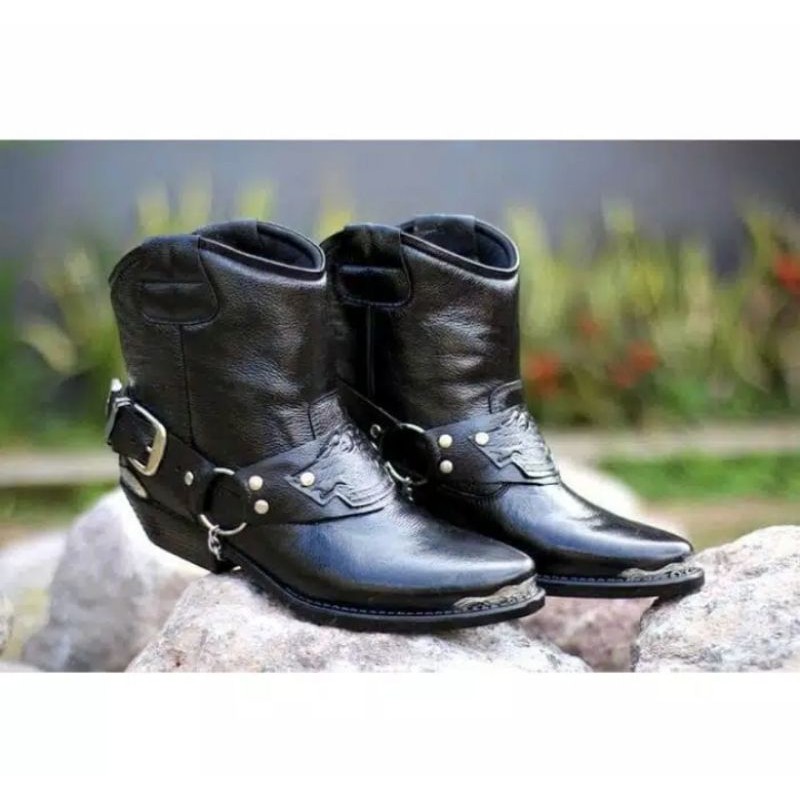 Detail Sepatu Kowboy - Sepatu Boots Pria Sepatu Koboi Kulit Kowboy Bikers Coboy Moge Joungle Original Hitam Black