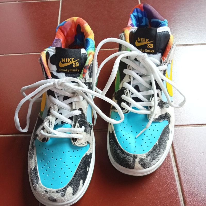spesifikasi : Merk : Nike SB Chunky Dunky material : kulit dan bagian corak sapi nya kulit berbulu, unik sekali Size : 42 insol : 26,5cm Made in Indonesia