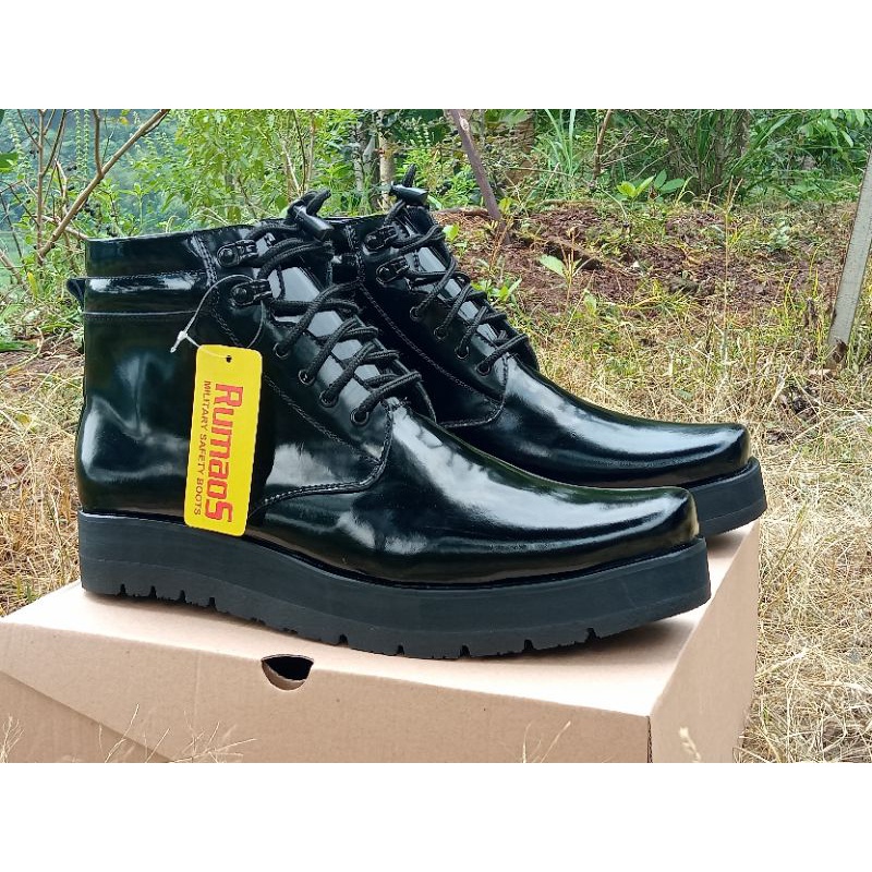 Detail Rum03 sepatu PDH tali outsol tebal 4-5 cm datar kulit hitam kilap