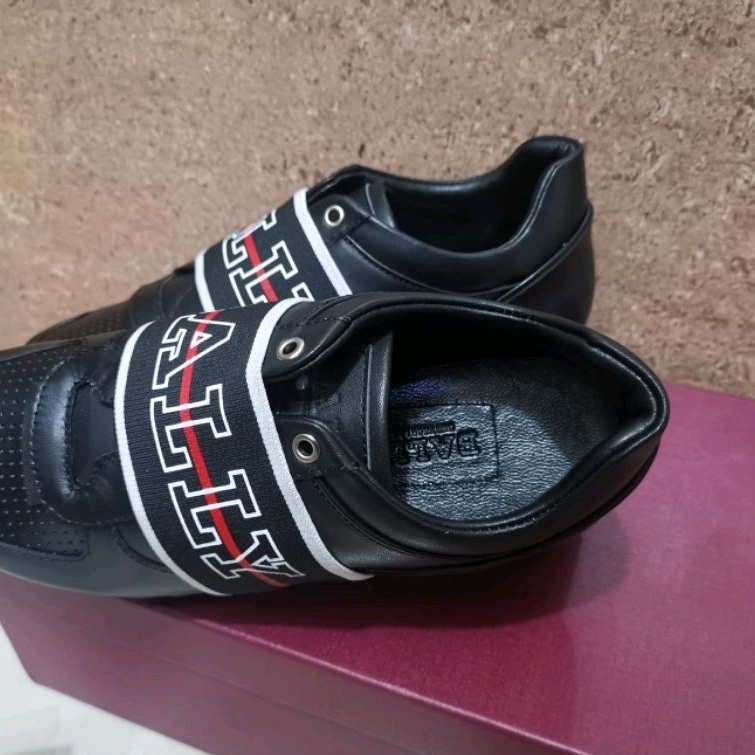 Detail sepatu pria hitam sneaker cowok slip on bal ly men shoes run away strip p1shoes new