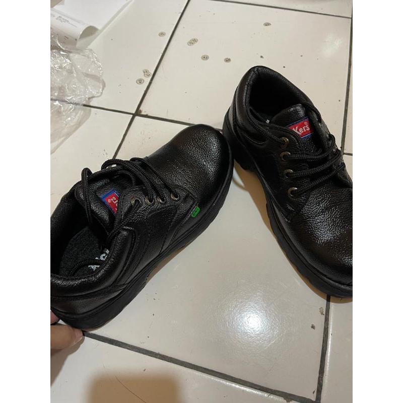 Detail sepatu safety Kickers boots ujung besi safety kerja lapangan, kerja koki