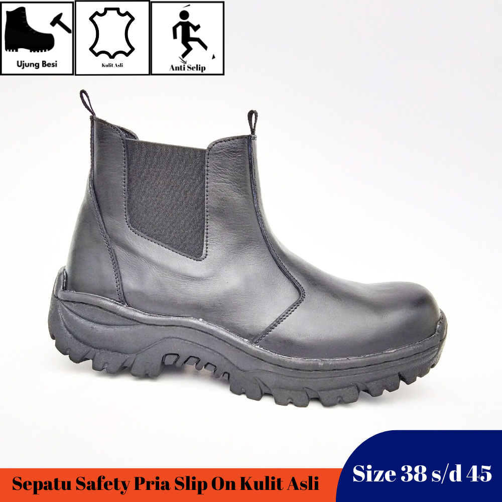 Sepatu Safety Kulit Asli Warna Hitam Ujung Besi Outsole Rubber Anti Selip Sudah Dijahit Pengikat Elastis Tanpa tali lebih simple dan praktis