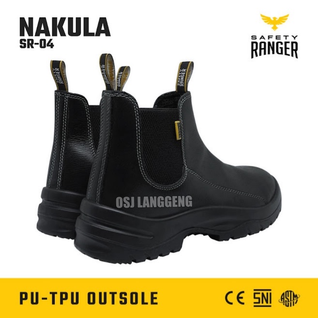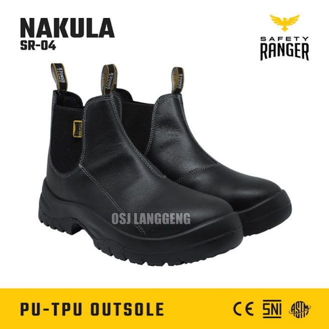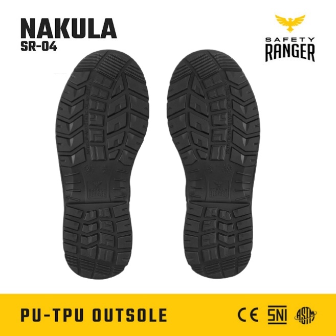 Fitur Safety Ranger NAKULA: - Steel Toecap - Tipe Pull-up - Midsole steel plate (optional) - Material sol PU-TPU - Material sol bagian dalam PU foam - Lining 3D Mesh Nylon