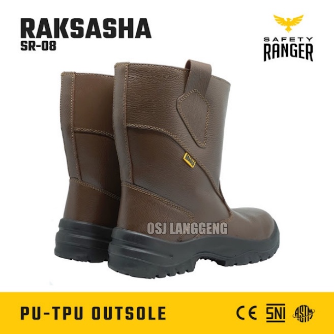 Safety Ranger Raksasha Model sepatu high-cut dari Safety Ranger adalah Safety Ranger Raksasha. Tokoh legenda Indonesia Raksasha menjadi inspirasi untuk sepatu dengan karakteristik kuat dan besar ini. Safety Ranger Raksasha adalah satu-satunya tipe sepatu safety boots untuk saat ini. Sepatu ini cocok untuk pekerja lapangan yang area kerjanya memiliki tingkat paparan terhadap bahaya menengah ke atas dengan perlindungan maksimal pada area paparan bahaya pada kaki.