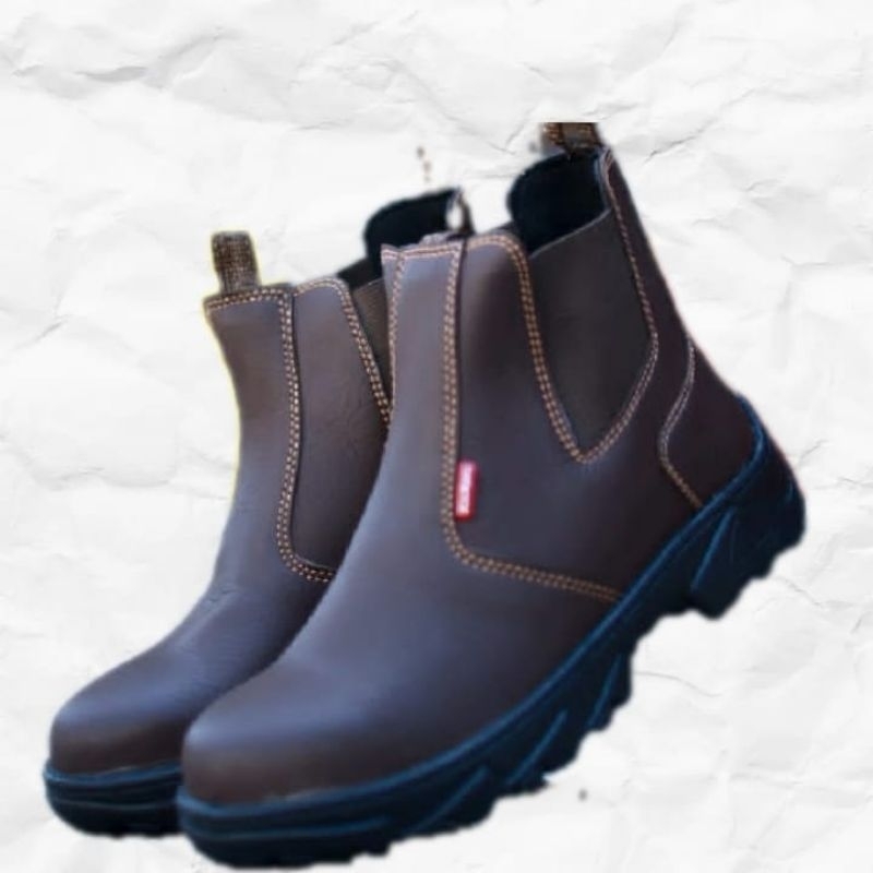 Detail sepatu Safety Septi Elastis Slip On Keselamatan Kerja Proyek Pabrik Bengkel Mekanik Kulit Impor Ujung Besi Sepatu