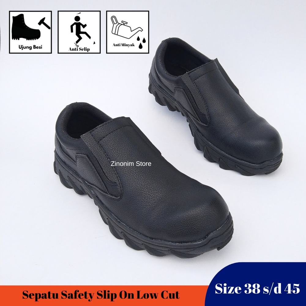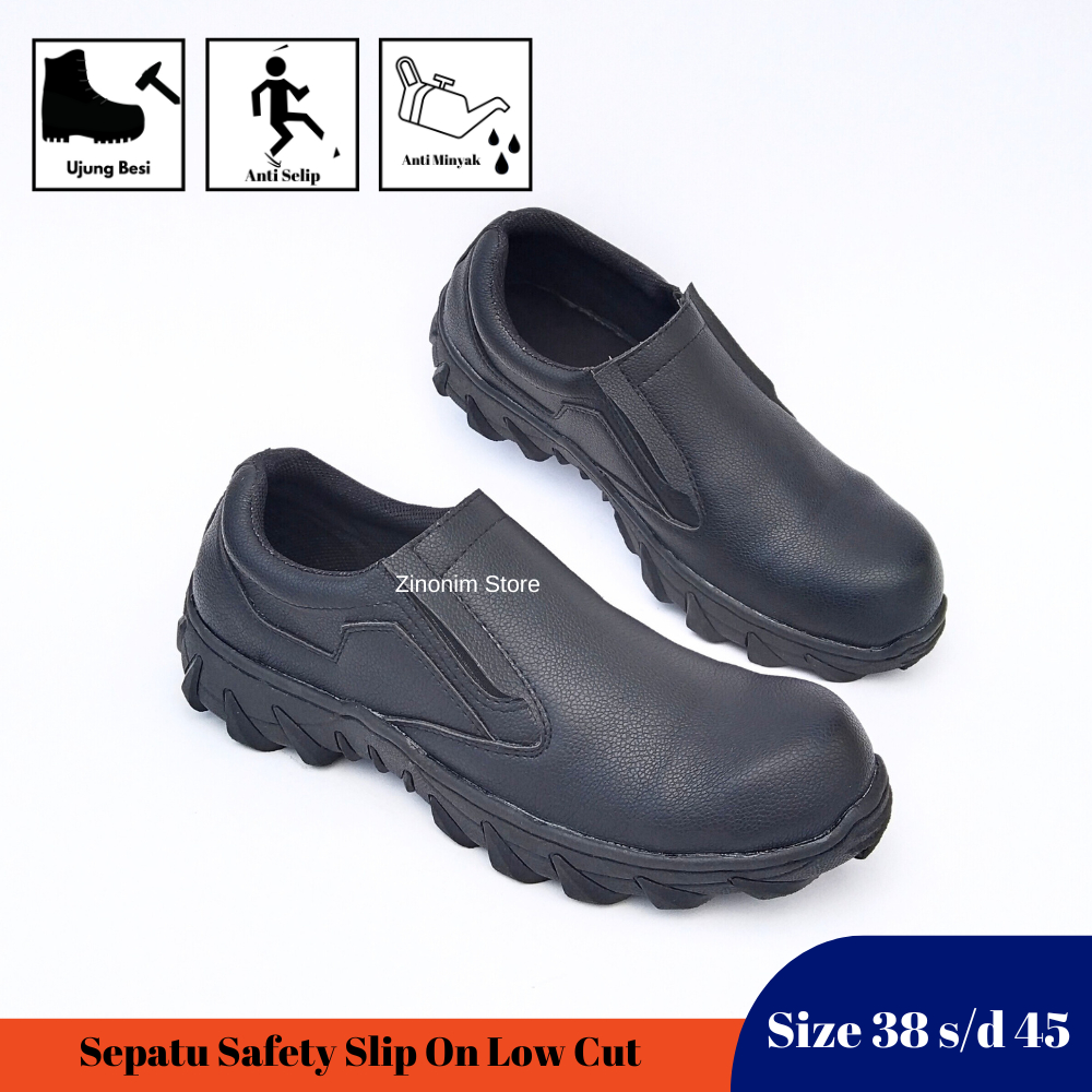 Detail Sepatu Safety Slip On Pria Low Cut Tanpa Tali Hitam Kerja Ujung Besi Ukuran 38 39 40 41 42 43 44 45 Zinonim Store