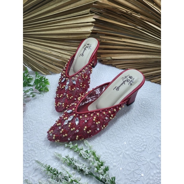 Detail sepatu wedding Marisa merah marron 7cm tahu
