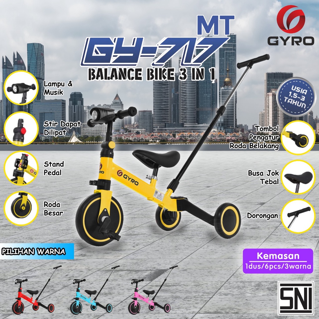 Sepeda balance bike GYRO 717 Sepeda tiga roda anak dengan desain menarik dan dilengkapi dengan: • MUSIK DAN LAMPU • rangka sangat kokoh • stir dapat dilipat • stand pedal • jok busa tebal • usia 18bulan-5th • max beban 30kg • roda besar • standar SNI