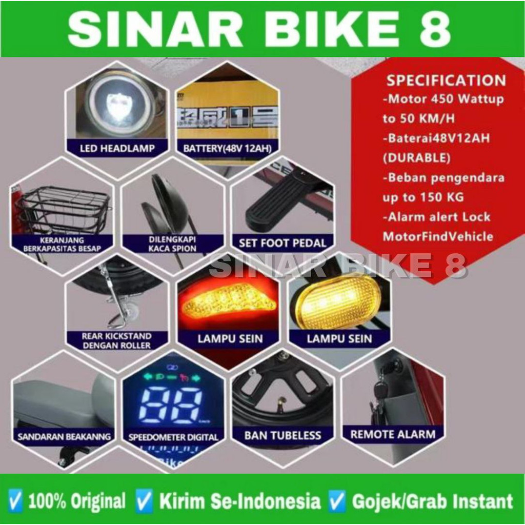 Spesifikasi : ️✅️ Motor Power 500 Watt x 48 V ✅️ Charger Input 220 V ✅️ Baterai 48 V x 12 Ah (12v x4pcs) ✅️ Waktu Charger 6-8 jam ✅️ Speed 25 km/jam ✅️ Jarak Tempuh 35 km - 40 km ✅️ Berat Pengguna max 120kg ✅️️ Ada Spion ✅️️ Bagasi Kuat dan Lebar ✅️️ Rangka kuat dan Kokoh ✅️️ Ban Tubles ✅️️ Lampu Depan Terang