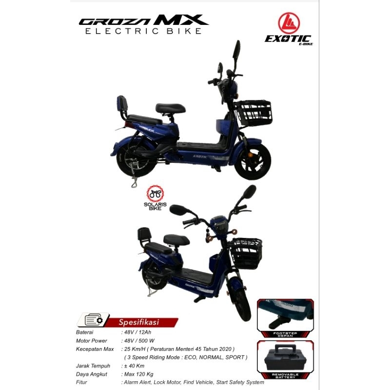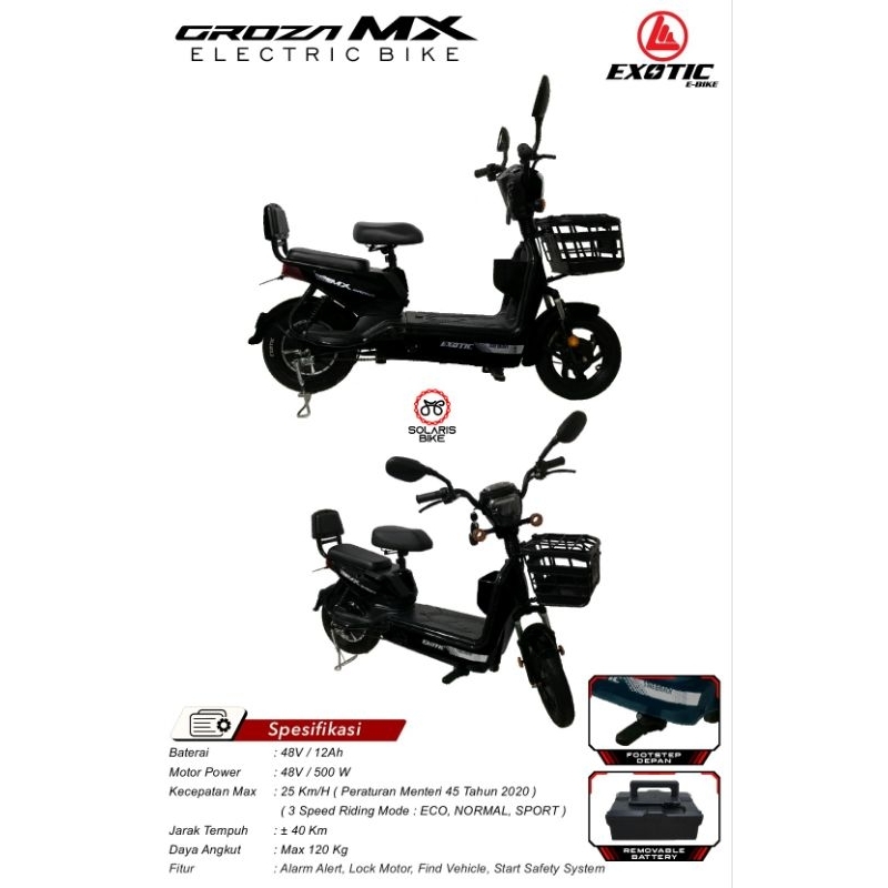 SPESIFIKASI GROZA MX Baterai : 48V / 12Ah Motor Power : 48V / 500W Kecepatan Max : 25Km/H ( Peraturan Menteri 45 Tahun 2020) Jarak Tempuh : 40 KM Daya Angkut : Max 120 kg Fitur : Alarm Alert,Lock Motor,Find Vehicle,Star Safety System