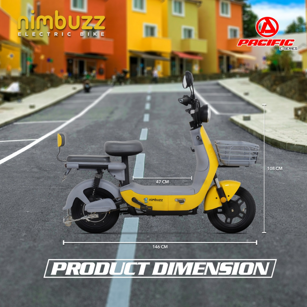 Product Specification : Model : Pacific Nimbuzz Motor power : 500w, up to 25km/h Voltage : 48v Battery : 48v20.2ah SLA Tire Size : Tubles 14x2.50 Jarak Tempuh : 60km/h Riding Mode : 3 Speed (ECO, NORMAL, SPORT) Dimension : 108x146x36cm Max Speed : 40km/h Charging time : 5-6h Max loading : 120kg