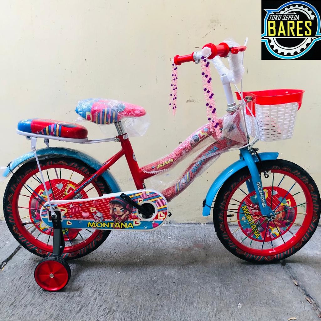Sepeda Mini Anak 12 / 16 / 18 Montana Aria - Merk: Montana - Model: Aria - Frame: Besi - Fork: Besi - Keranjang - Penutup rantai - Ada boncengan - Rem Depan: U-brake - Rem Belakang: Tromol - Hub: 20H - Ruji: 12G - Ban: 1.75