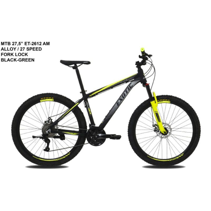 NEW!!!MTB 27,5 27 SPEED TERMURAH..EXOTIC 2612 AM FORK LOCK ASLI & BARU BER-SNI SPECIFIKASI SPEED:27SPEED FRAME:ALLUMUNIUM 27,5 HYDROFORMED NEW COLOUR SIZE:27.5" FORK:FORK WITH SUSPENSION TRAVEL 120MM WITH LOCKOUT CRANK SET 42T-32T-28T BOTTOM BRACKET:BEARINGS REAR DERAILLEURE:AGHATOS 27 SPEED(LOOK LIKE DEORE) SHIFTER:AGHATOS LEFT 3 SPEED, RIGHT 9 SPEED (LOOK LIKE DEORE) F/R BRAKE:MECHANICAL DISC BRAKE 160MM ROTOR F/R HUB: STEEL WITH 6 BOLT FOR ROTOR WITH QUICK RELEASE CASSETE: 9 SPEED AGHATOS SADDLE:EXOTIC SADDLE F/R TIRE: 27.5 X 2.20 KENDA WHEEL: DOUBLE WALL RIMS STEM: EXTENSION 40MM HANDLE BAR 720 MM ALLUMUNIUM SEAT POST WITH QUICK RELEASE
