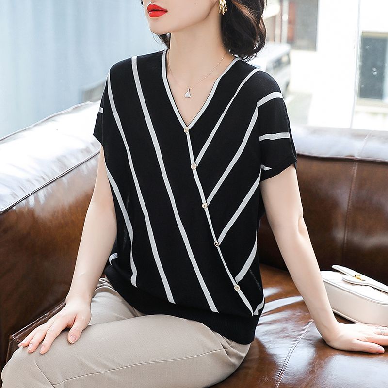 ✗♝☽Sera Hazel.green high-end mother dress gaya barat musim panas bergaris T-shirt lengan pendek es sutra kemeja kecil wanita paruh baya berusia 40 tahun setelan atasan kecil