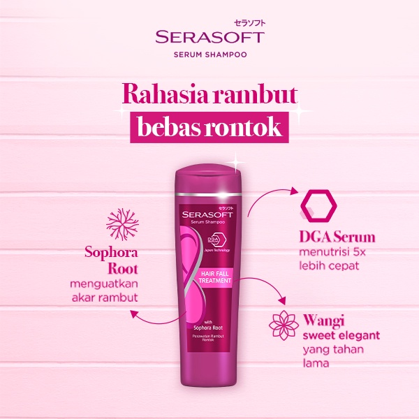 SERASOFT Shampoo Hair Fall Treatment 170ml merupakan shampo persembahan Serasoft yang memiliki kandungan DGA serum dengan teknologi Jepang yang menutrisi dari dalam yang dapat merawat kekuatan helai rambut. Shampo ini sangat cocok untuk kondisi rambut yang tipis dan mudah rontok. Shampo ini membuat rambut Anda jauh lebih kuat dan tebal dan tidak mudah rontok. Selain itu, shampo persembahan Serasoft ini tersedia dalam kemasan yang praktis dan mudah untuk digunakan.