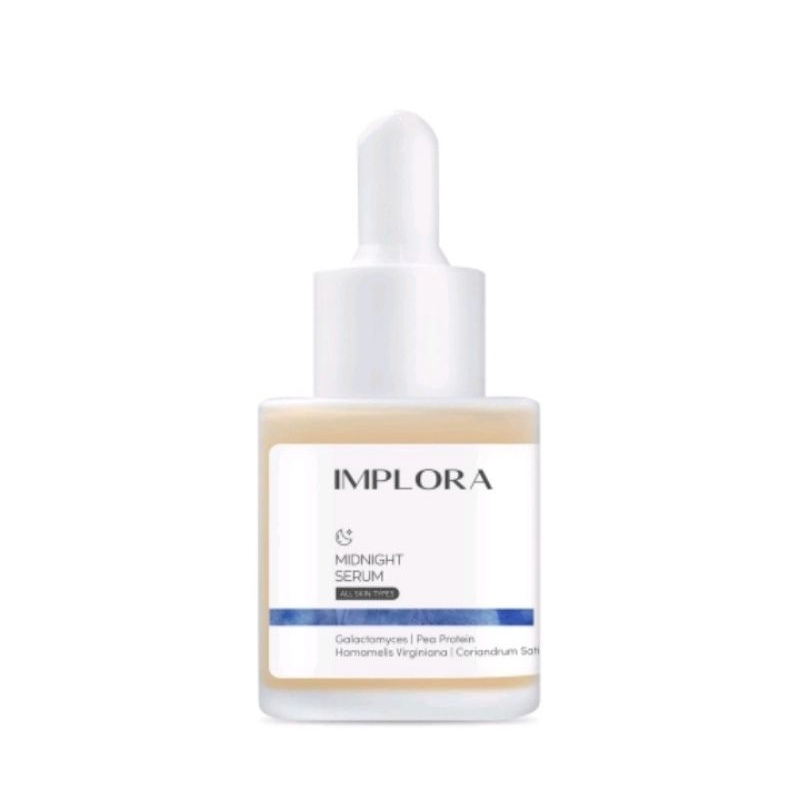 *MIDNIGHT SERUM Implora Midnight Serum mengurangi beberapa tanda penuaan diri pada wajah. Membantu menutrisi kulit, melembabkan serta menyamarkan noda hitam di wajah. Maksimalkan tampilan kulit yang terlihat lebih cerah, sehat dan kencang dengan penggunaan secara teratur. - Direkomendasikan untuk semua jenis kulit - Penggunaan malam hari - Mengandung : Galactomyces, Pea Protein Hamamelis Virginiana Coriandrum Sativum
