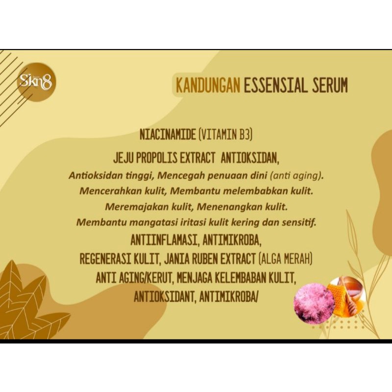 Ingridient serum : - Minyak pro - Minyak bulus - Vit E - Astaxantin - Fragrance Kesemuanya diproses fermentasi dengan G.10 selama 7-14 hari. Jadilah formula yang bermanfaat : - Membantu menyehatkan tekstur kulit - Kulit menjadi sehat dan segar ,serta menghilangkan flek-flek-flekkerutan-kerutan .