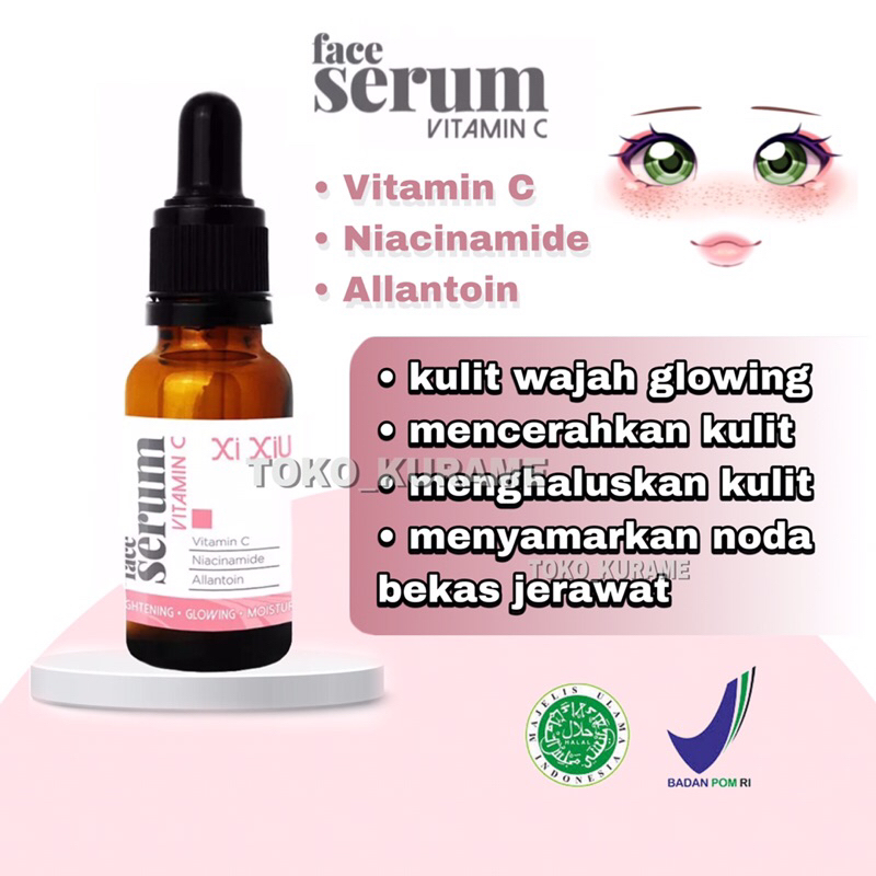 No Bpom: NA18201901200 Face Serum Vitamin C by Xixiu cosmetic Hadir dengan Double Brightening Active Ingredients yaitu Vitamin C dan Niacinamide yang memiliki manfaat mencerahkan, menghaluskan kulit serta menyamarkan noda bekas jerawat dan kandungan Allantoin sebagai Anti-irritant.