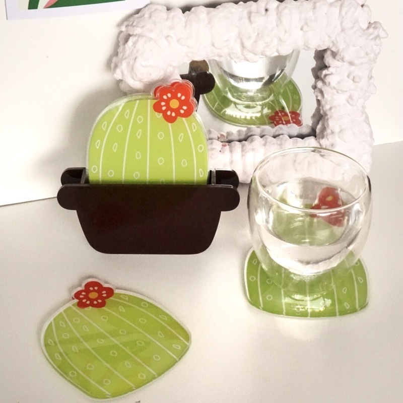 Tatakan gelas akrilik adalah tatakan gelas yang terbuat dari material akrilik yang di print uv sehingga tahan air dan lebih awet, berbentuk tamanan kaktus yang berfungsi untuk melindungi permukaan meja. Desain tatakan gelas kayu ini juga dapat digunakan sebagai hiasan dan dekorasi agar estetika penampilan sajian minuman memiliki nuansa yang lebih ceria dan menarik.