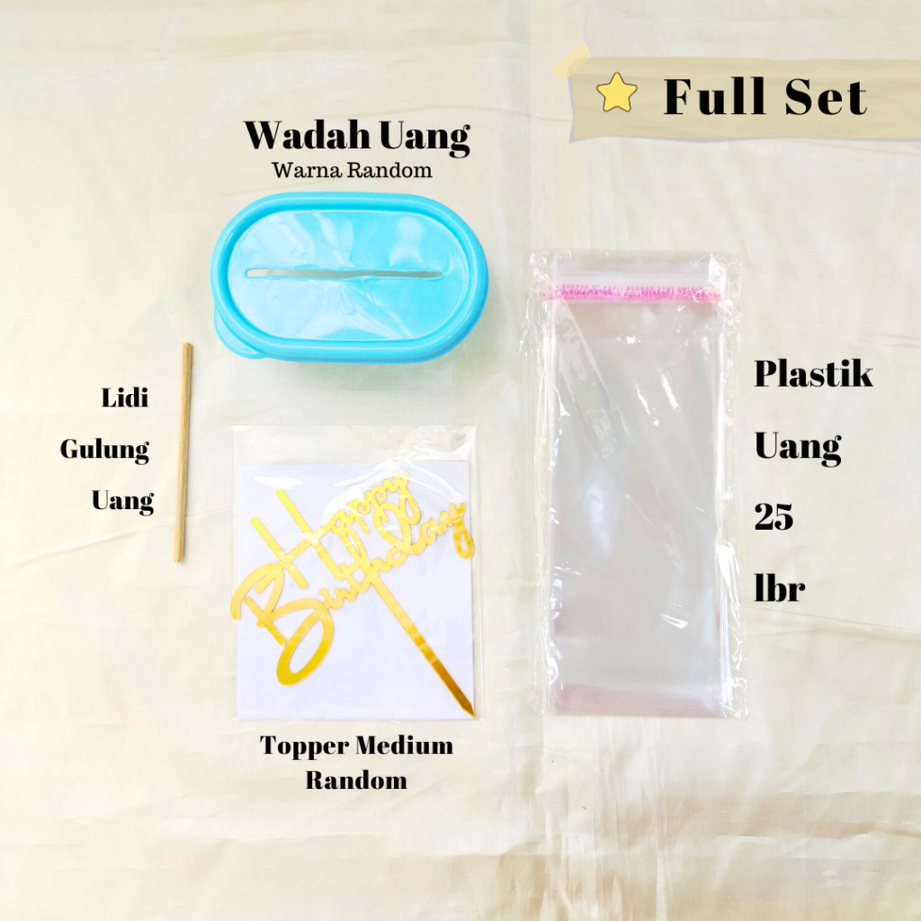 Full Set - Wadah Uang ( Kecil Muat 30 lbr, Besar muat 50 lbr ) - Lidi - Plastik Uang ( 50 lbr ) - Topper Happy Birthday motif Random sesuai stock