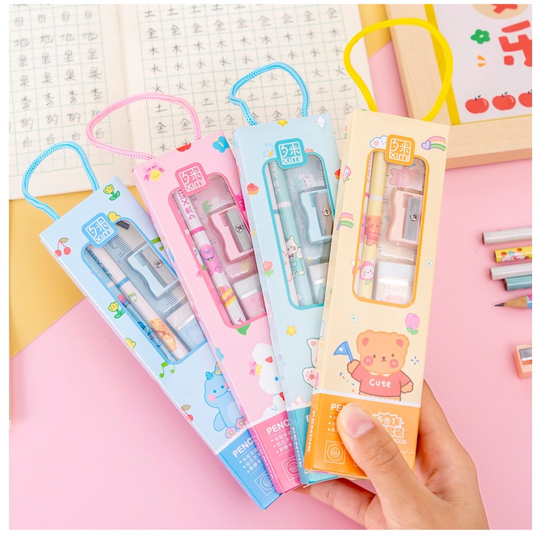 Set Alat Tulis Pensil Penghapus Rautan Penggaris Penghapus Untuk Anak Sekolah Perlengkapan Sekolah Lucu Cocok Untuk Souvenir Hadiah Stationery Set Pencil 5 piece Set School Gift Portable Box