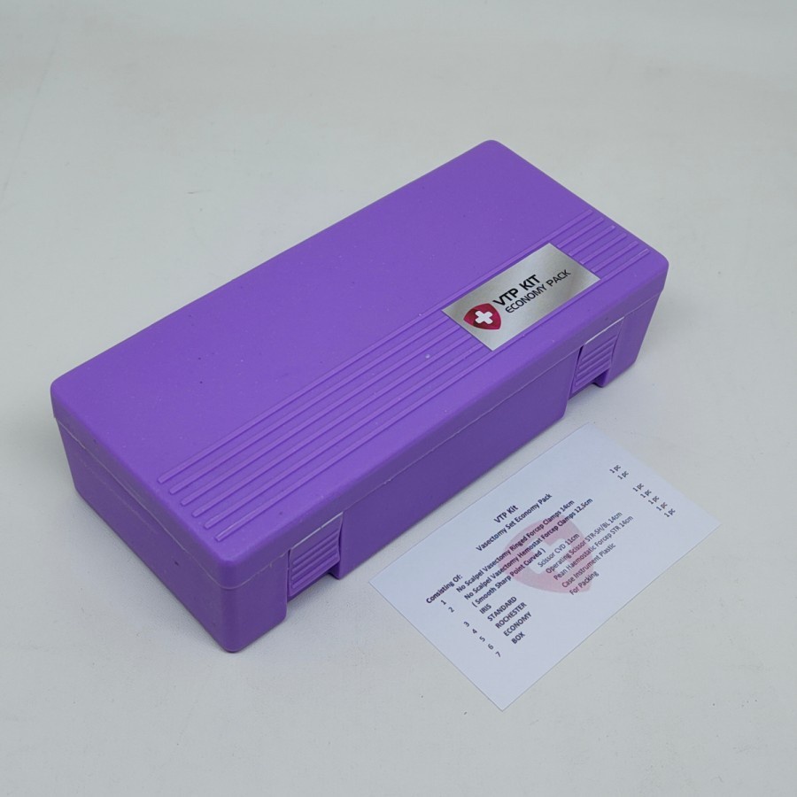 1. No Scalpel Vasectomy Ringed Clamps 14 cm 1 pcs 2. No Scalpel Vascetomy Hemostat Forcep Clamps 12,5 cm 1 pcs (Smooth Sharp Point Curved) 3. Iris Scissor CVD 11 cm 1 pcs 4. Standard Operating Scissor STR-SH/BL 14 cm 1 pcs 5. Rochester Pean Haemostatic Forcep STR 14 cm 1 pcs 6. Economy Case Istrument Plastic 1 pcs 7. Box For Packing 1 pcs
