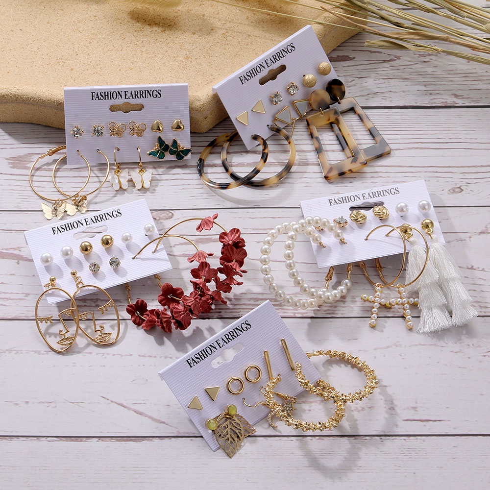 Nama: Fashion Mutiara Anting Set Akrilik Wanita Klip Telinga Rumbai Liontin Kupu-kupu Anting Perak Daisy Ear pin Aksesoris Wanita