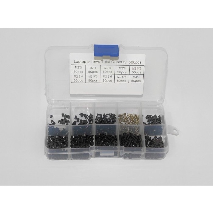 Paket 1 berisi 500 Pcs : 50pcs x M2x3 Laptop Screws 50pcs x M2x4 Laptop Screws 50pcs x M2x5 Laptop Screws 50pcs x M2x6 Laptop Screws 50pcs x M2.5x3 Laptop Screws 50pcs x M2.5x4 Laptop Screws 50pcs x M2.5x5 Laptop Screws 50pcs x M2.5x6 Laptop Screws 50pcs x M3x3 Laptop Screws 1 x Kotak Tempat Plastik