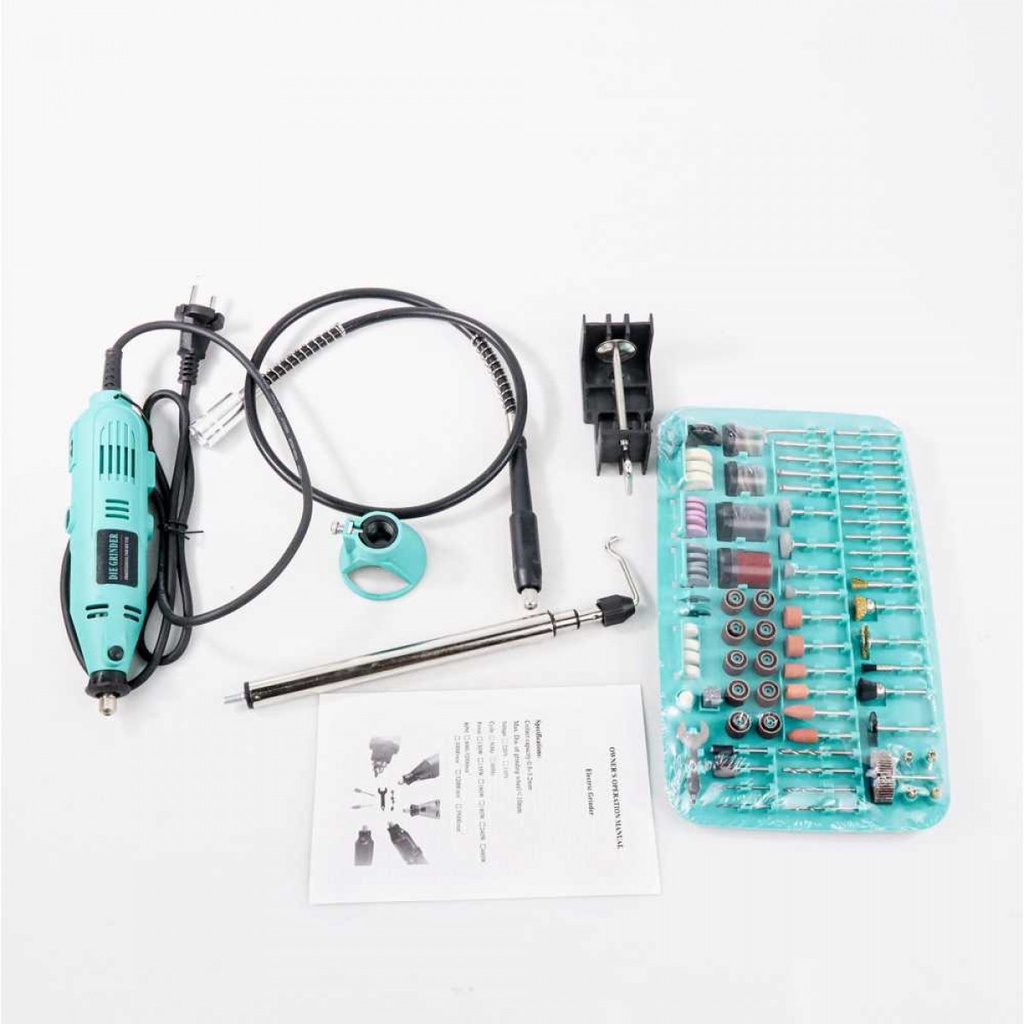 Spesifikasi Daya / Power 130 W Material Bodi Mesin: Plastik Dimensi Chuck Size: 3.2 mm Panjang: 23 cm Lain-lain Isi: 280 PCS No Load Speed: 8000-32000 RPM Voltase: 220 V Frekuensi: 50 Hz