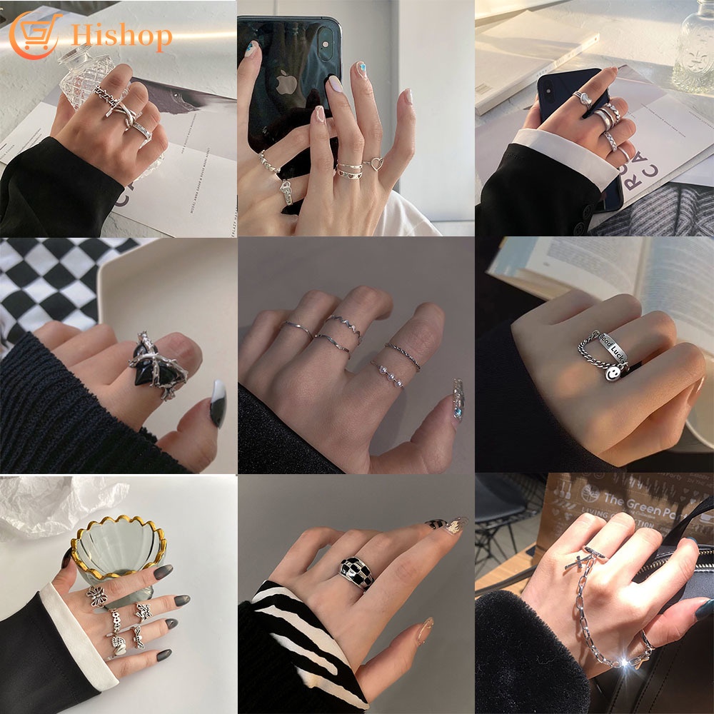 Detail Set Cincin Adjustable Motif Kotak-Kotak Aksen Mutiara Warna Silver Gaya Korea Untuk Wanita
