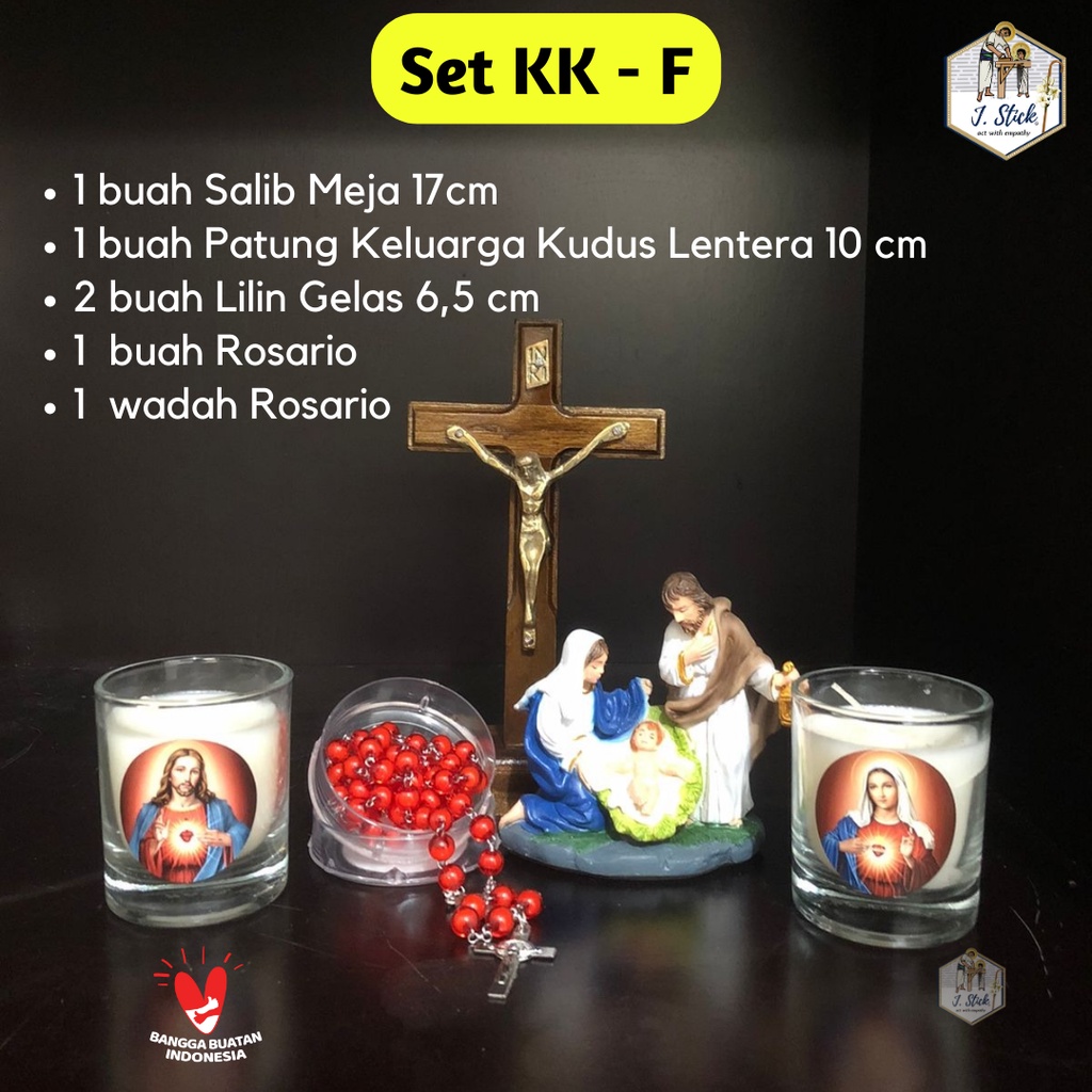 🔷Set Doa - KKC terdiri dari : 1 Salib Meja kayu jati, corpus kuningan, 17 cm 1 Patung Keluarga Kudus bahan fiber. Tinggi +/- 15 cm 2 Lilin pilar 10 cm diameter 4,2 cm, lilin dengan mika + tatakan alumium, gambar Yesus dan Maria 1 Rosario dan wadahnya (warna rosario berdasar ketersediaan)