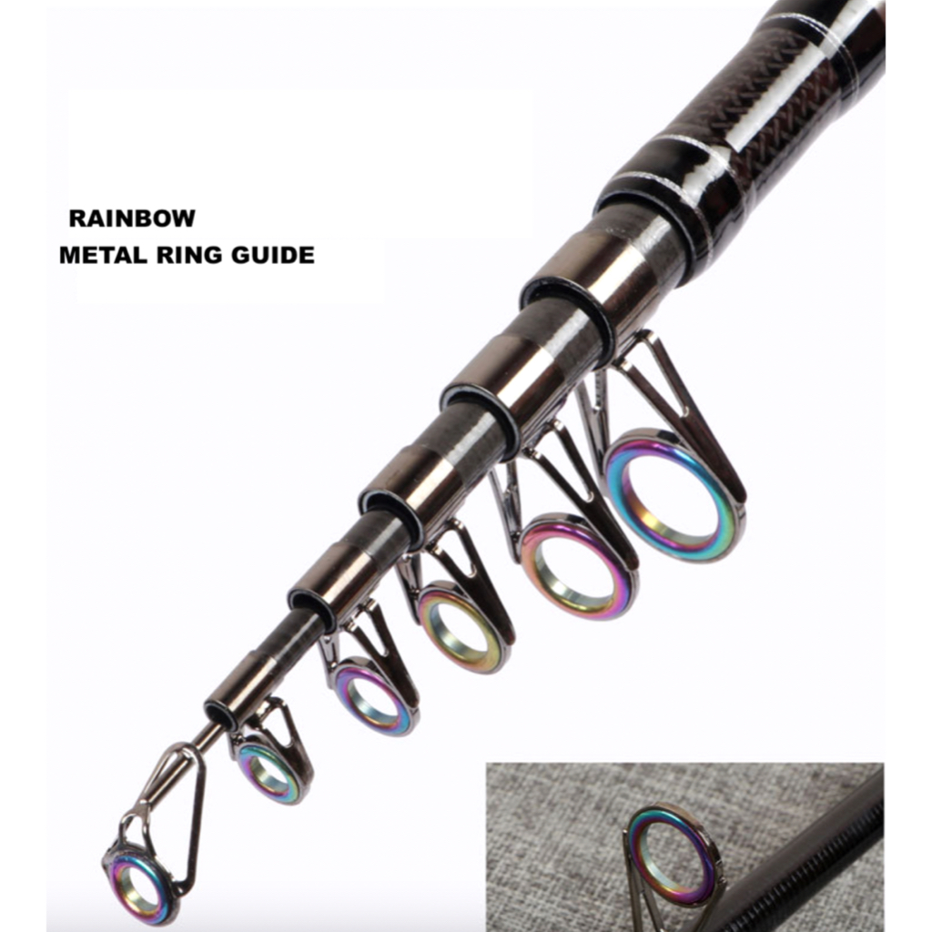 1.Fishing rod Ultralight Portable Ruas pendek Ring Guide Rainbow Metal Tipe: Casting Rod dan Spinning rod 180-- 5 ring guide--berat 120gr-diameter atas 1.6mm-diameter bawah 11.8mm 210--5 ring guide--berat 138gr-diameter atas 1.6mm-diameter bawah 13.6mm 240--6 ring guide--berat 138gr-diameter atas 1.6mm-diameter bawah 13.6mm spesifikasi : - Bahan Carbon Fiber - Ruas tertutup 55 cm - ukuran 180/210/240 -lure weight 10-20 gr -line weight 10-25LB -warna Hitam -EVA handle -Kelenturan MH