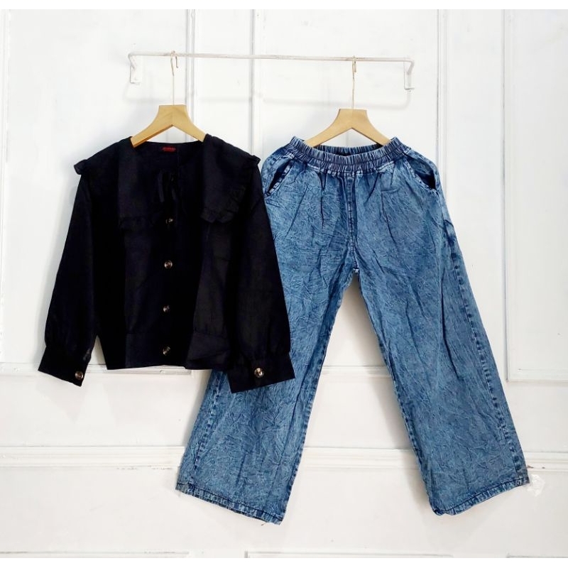 Set Kulot Jeans Cardi Crop Linen//One Set Kulot Jeans//Set Celana Wanita