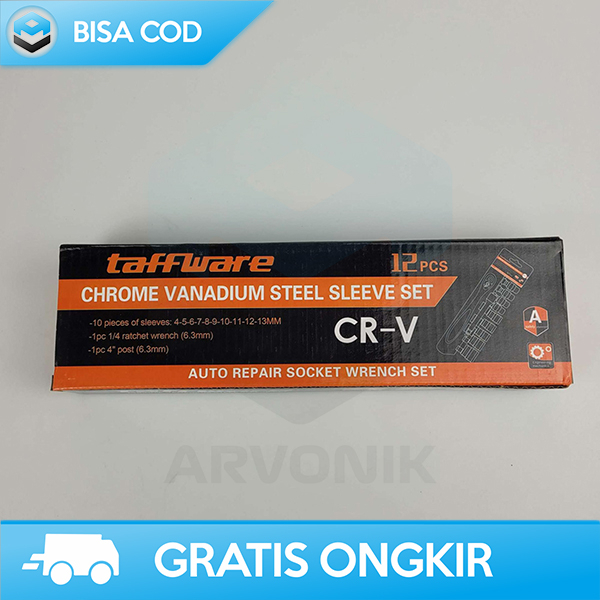 1 x 1/4-Inch ( 6.3 mm ) Kunci Ratchet 10 x Socket 1 x 100 mm Ekstensi Mata Kunci Spesifikasi Material Chrome Vanadium Steel dan ABS Dimensi Kunci: 150 mm Diameter Soket: 4 mm, 5 mm, 6 mm, 7 mm, 8 mm, 9 mm, 10 mm, 11 mm, 12 mm, dan 13 mm Panjang Soket: 25 mm Panjang Ekstensi: 100 mm