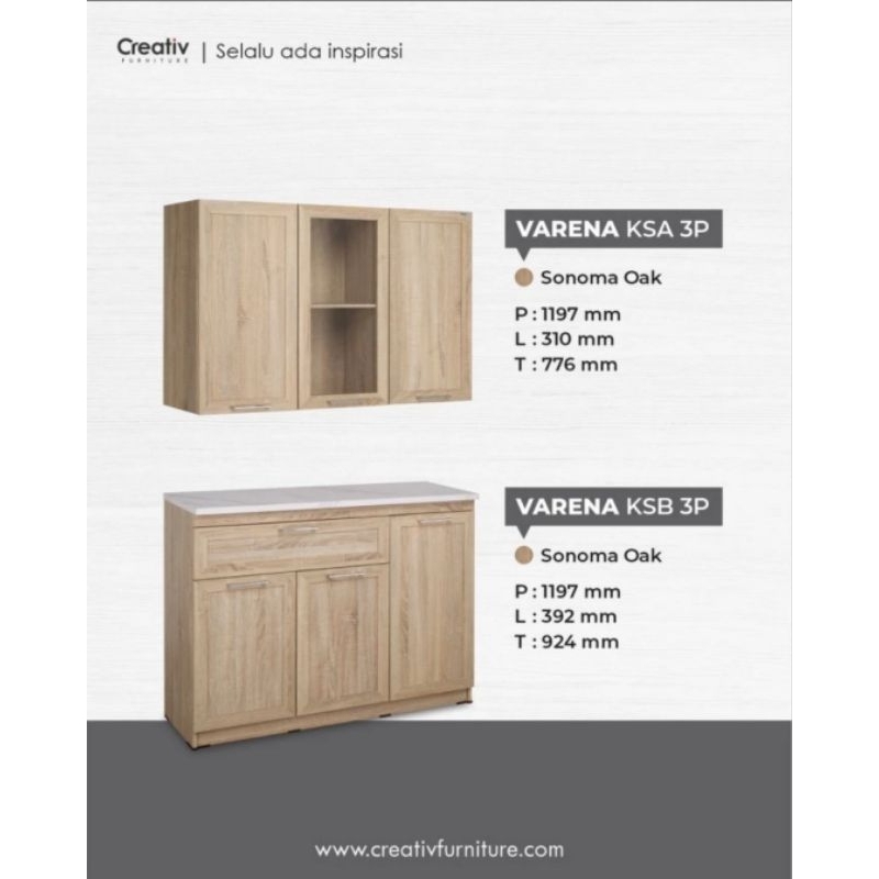 ✨Varena KSB Kelebihan: • Top table particle board, laminasi PVC • Sistem konstruksi frame pada panel pintu • Dilengkapi lemari dan laci