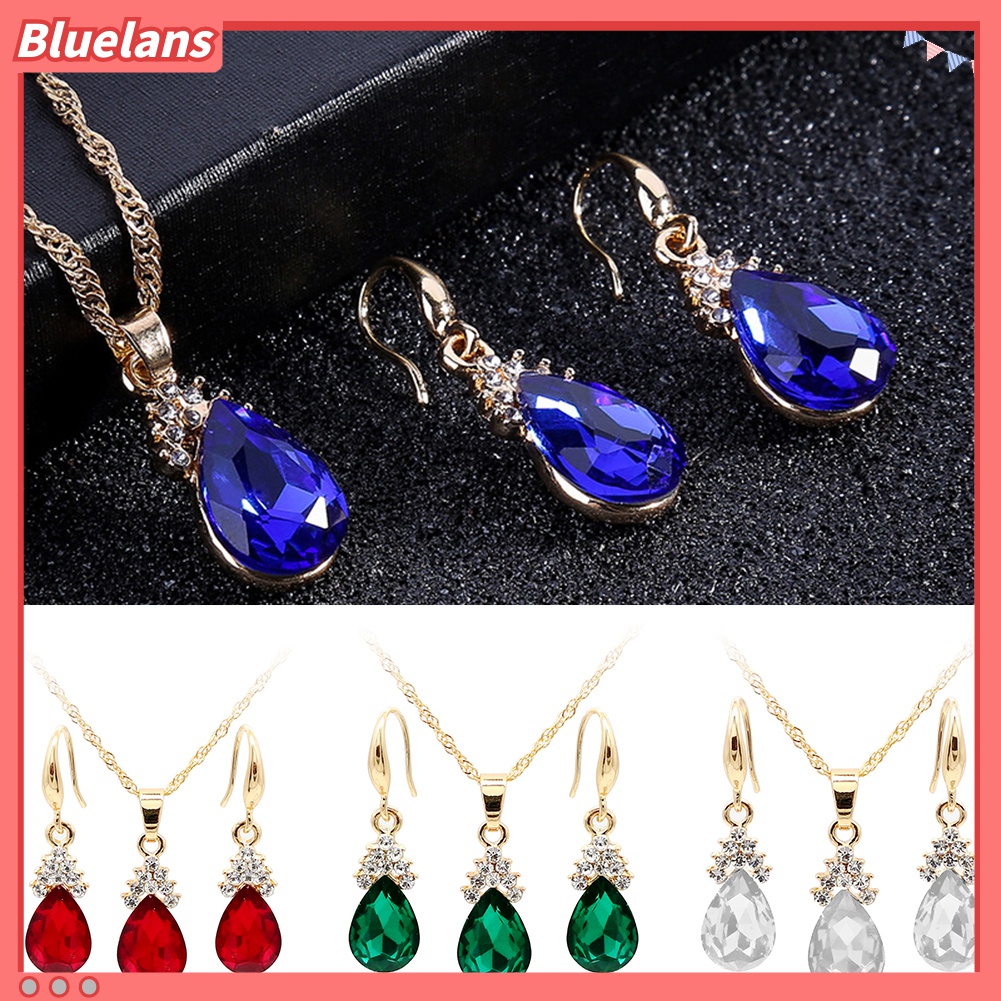 Detail Set Perhiasan Kalung Anting Kait Liontin Teardrop Aksen Berlian Imitasi Gaya Vintage Untuk Wanita