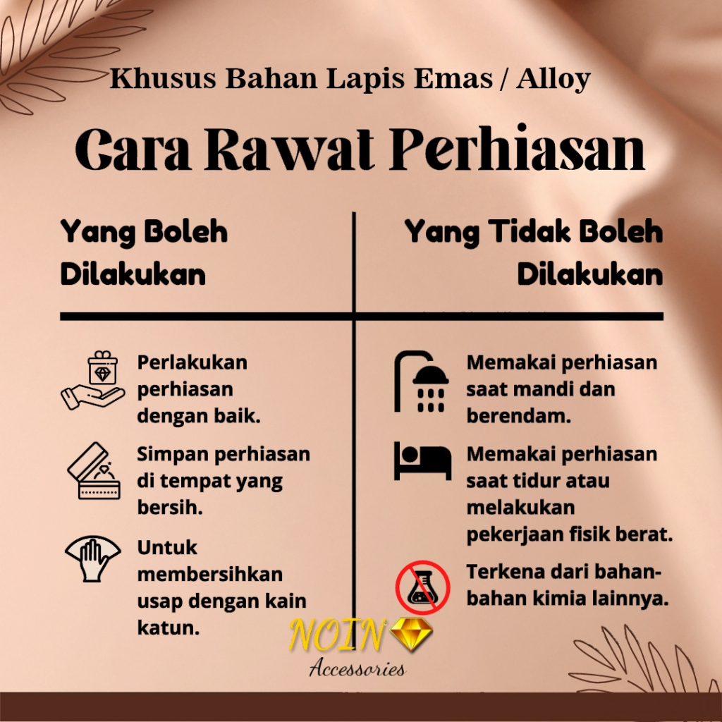Hal yang harus dihindari agar tidak berubah warna -. Hindarkan aksesoris dari keringat dan zat kimia dalam parfum, hair spray, aseton, kosmetik, kolam renang, deterjen, dll -. Kalau dipakai untuk sehari-hari, jangan lupa dilepas setiap melakukan pekerjaan rumah tangga atau pekerjaan lain yang memungkinkan aksesoris terpapar bahan kimia.