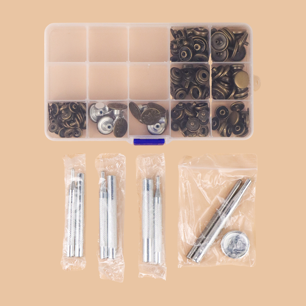 Kelengkapan Produk 40 x Set Perlengkapan Jahit Poppers Leather Craft with Fixings Tools Kit - XG-90003 1 x Kotak Penyimpanan