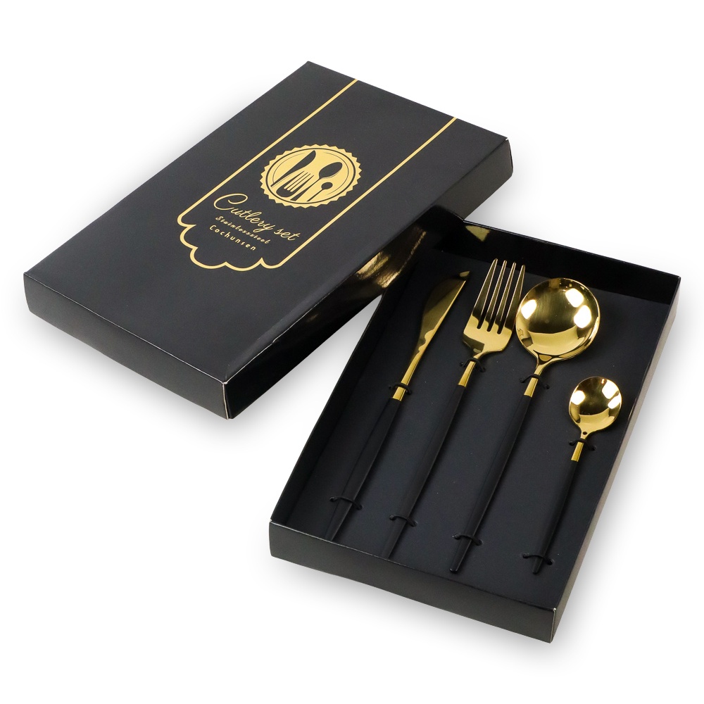Detail Set Perlengkapan Makan Dapur Sendok Garpu Pisau Warna Hitam Emas