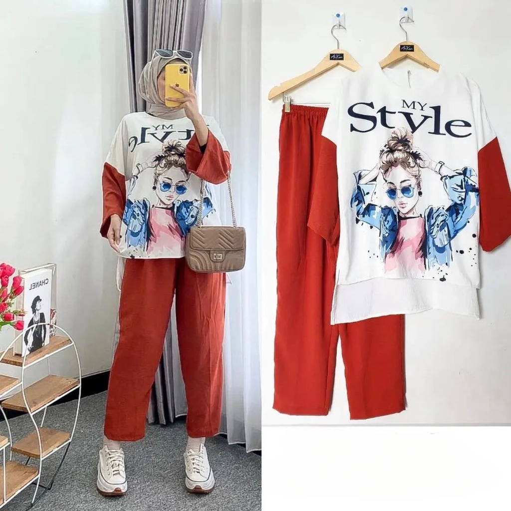 SET STYLE BAHAN CRINKLE AIRFLOW APLIKASI SABLON UKURAN M L XL SETELAN WANITA KEKINIAN FASHION MUSLIM ONE SET WANITA KOREAN STYLE BAJU ATASAN DAN BAWAHAN WANIITA SET MUSLIM