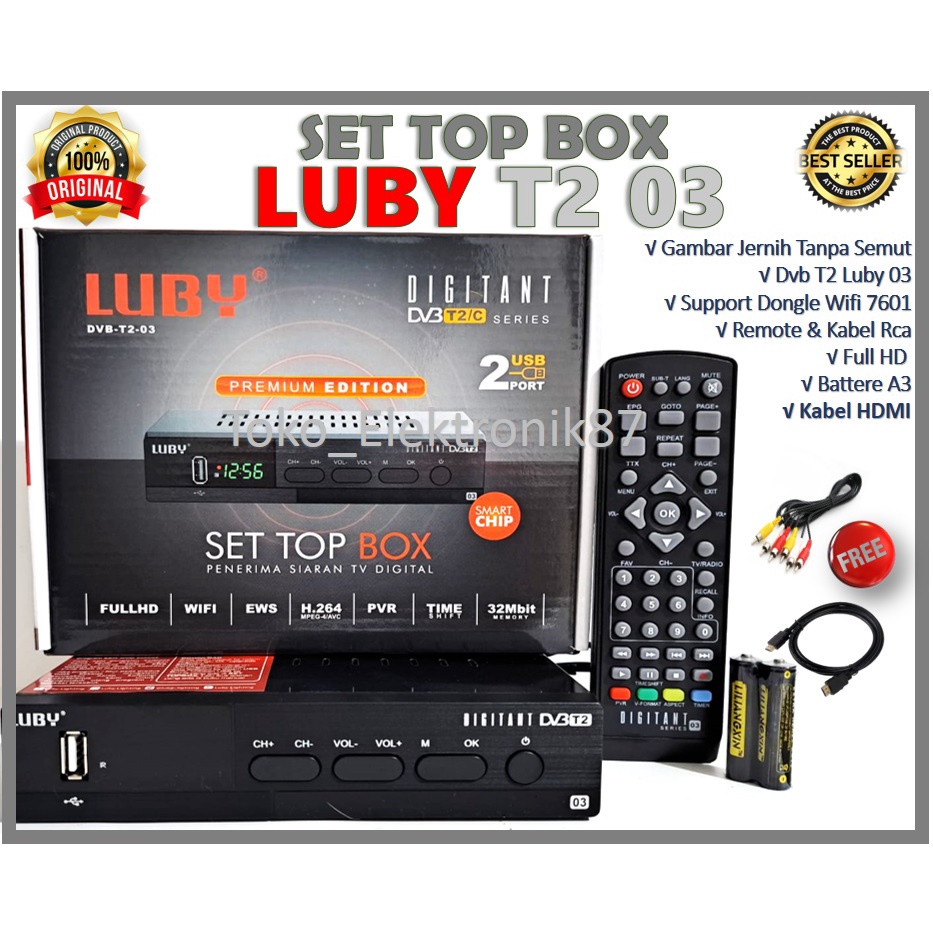 kelengkapan Unit : Paket 01+RCA : 1 Unit Dvb T2 LUBY 01 1 unit Remote 2 unit Battere A3 1 unit Kabel 3rca