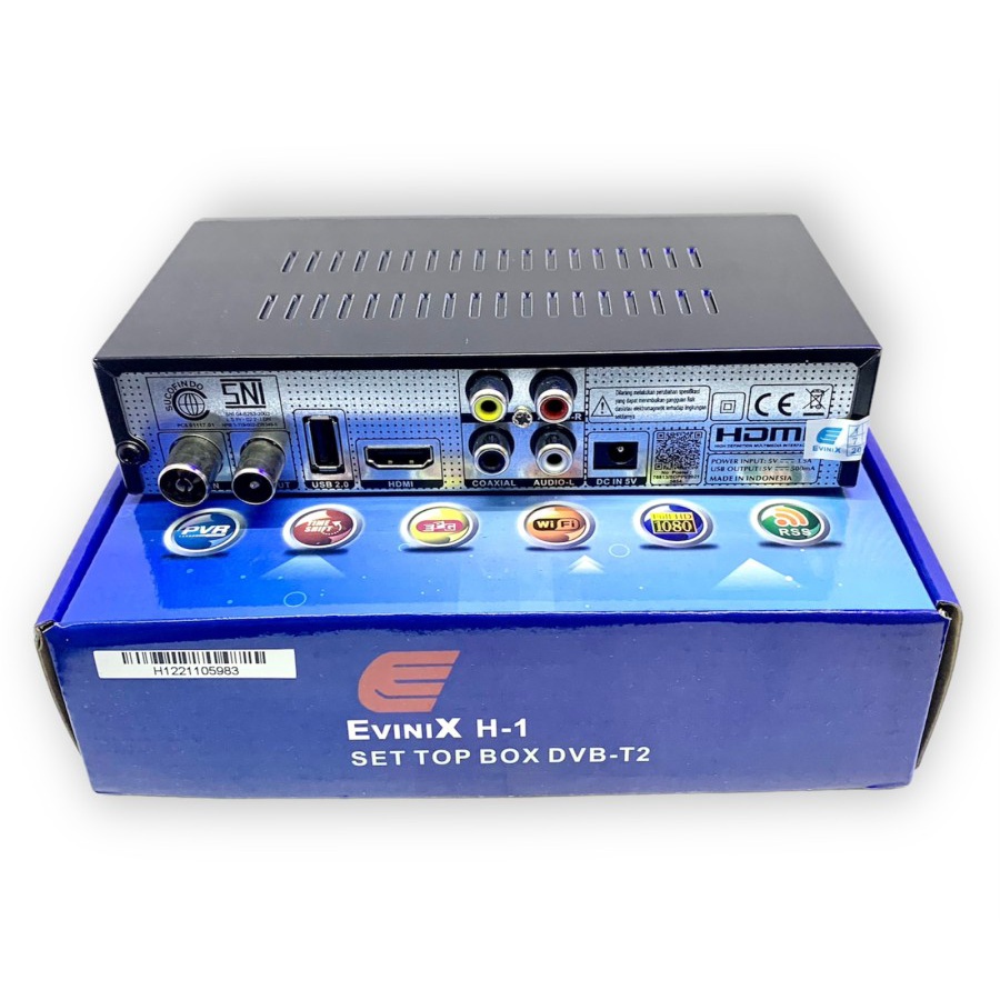 Set top box evinix H1 New Generation pembaharuan versi lama dilengkapi dengan dual UI dan Adaptor sebagai daya ke listrik, sudah mengatasi masalah elco rusak pada versi sebelumnya sehingga lebih awet dan tahan lama ,