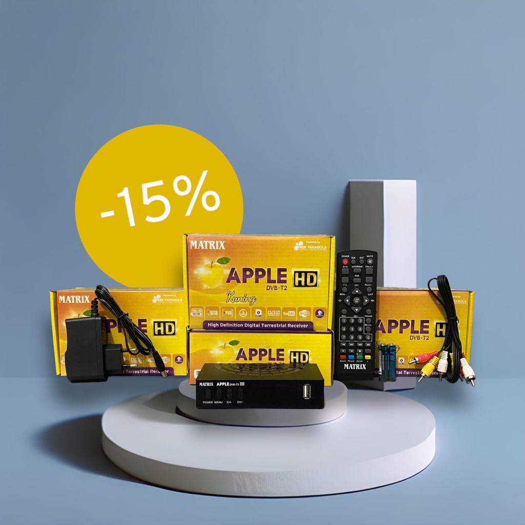 ISI PAKET : 1 unit STB Matrix DVB-T2 Apple Kuning 1 unit Remote Control 2 pcs Baterai 1 pc Kartu Garansi 1 pc Kabel RCA