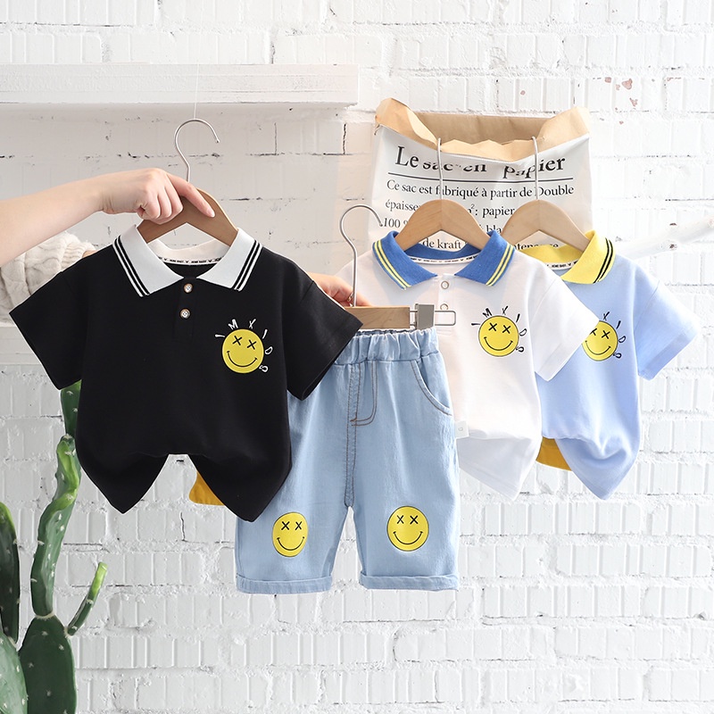 Setelan Fashion Pakaian anak Import : - 1pc Atasan Kaos katun kerah Polo - belakang EMOJI kaki timbul 3d - 1pc Celana jeans (soft) - pinggang full karet Import Quality - 100% baru Summer Design - dirancang untuk anak yg aktif bergerak di musim panas, bahan halus dan lembut - menyerap keringat cocok untuk anak yang aktif dan trendy - nyaman dipakai