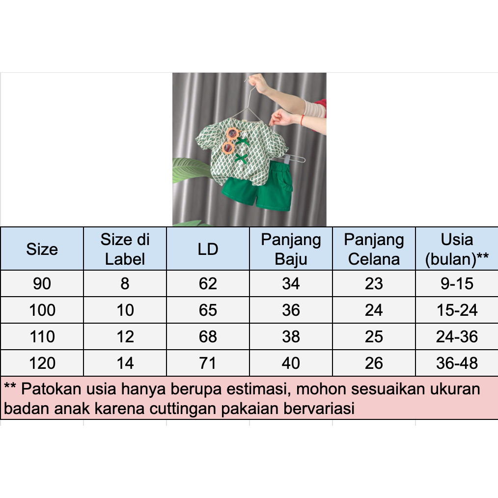 📌Detail ukuran : - 90 (15-24bln) Ld: 62cm, Panjang Baju : 34cm, Panjang Celana: 23cm - 100 (2-3tn) Ld: 65cm, Panjang Baju : 36cm, Panjang Celana: 24cm - 110 (3-4thn) Ld: 68cm, Panjang Baju : 38cm, Panjang Celana: 25cm - 120 (4-5thn) Ld: 71cm, Panjang Baju : 40cm, Panjang Celana: 26cm
