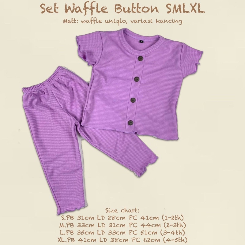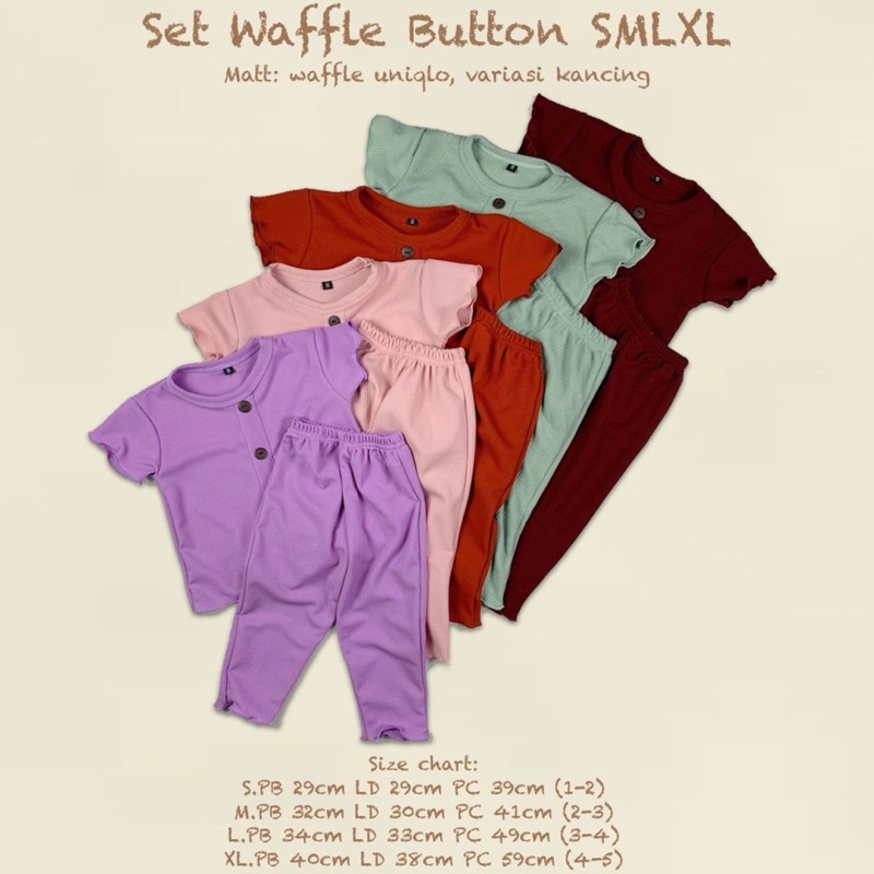SETELAN WAFFLE ORIGINAL ======================== DETAIL SIZE ========== * Size S : LD -+ 29 CM / PB : -+ 29 CM / PC : -+ 39 CM (1-2 th) * Size M : LD -+ 30 CM / PB : -+ 32 CM / PC : -+ 41 CM (2-3 th) * Size L : LD -+ 33 CM / PB : -+ 34 CM / PC : -+ 49 CM (3-4 th) * Size XL : LD -+ 38 CM / PB : -+ 40 CM / PC : -+ 59 CM (3-4 th) ( LD = Lebar Dada / PB = Panjang Baju / PC = Panjang Celana )