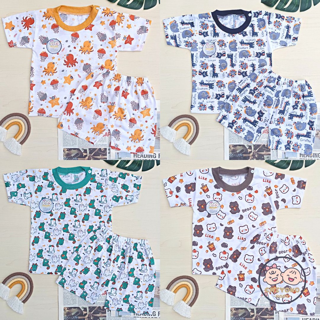 Setelan Baju bayi lengan pendek 100% Realpict rekomendasi unutk bayi 3-12 Bulan Spesifikasi Ukuran LD 28cm PB 38cm Terbuat dari bahan katun TC menyerap keringat Beberapa variasi motif dan warna : - Octopus Mustard - Cat Hijau - Giraffe Navy - Bear Coklat