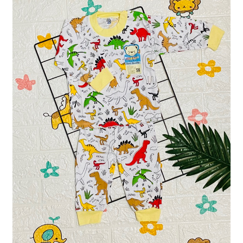 setelan baju bayi lengan panjang untuk usia 3-12 bulan dengan motif dino yang lucu, untuk bahan lembut tidak panas di pakai oleh bayi. variasi warna pelet lingkar leher : kuning hijau biru