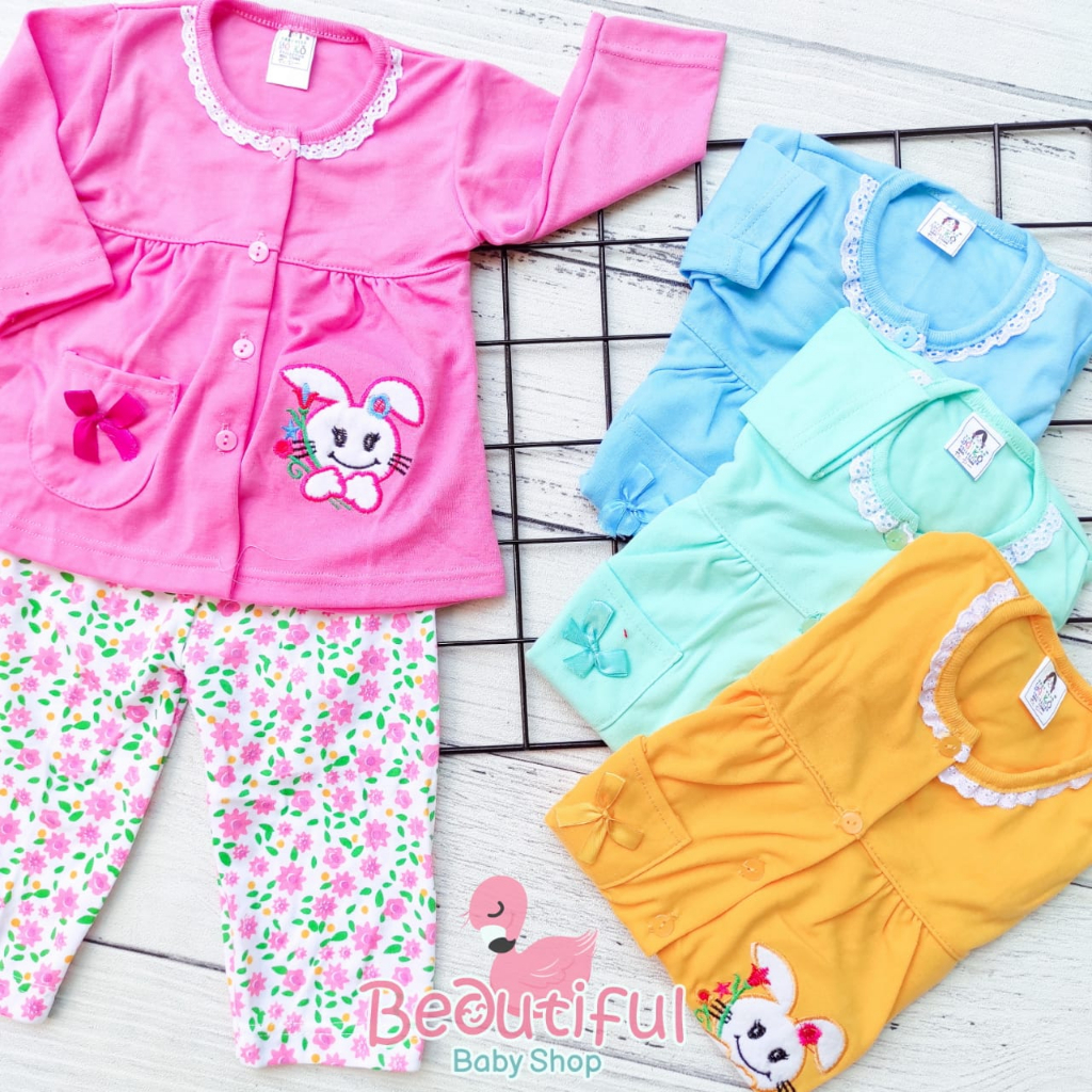 Bahan Katun 100% Halus, Nyaman Dipakai, Nyerap Keringat Cocok dipakai untuk sehari-hari ya mom Harga Untuk Satu Setel ya mommy ------------------------- Warna : Pink Hijau Biru Kuning ------------------------ Size 3-12 Bulan (All size) Details Size Baju: LD - 27cm PJ - 37cm Celana: Pinggang full karet Lingkar Paha - 32cm PJ - 39cm ------------------------- CATATAN Size hanya perkiraan ya mom, semua balik lagi ke postur tubuh baby , agar lebih akurat bisa diukur LD dan PJ celana ya , kami tidak menerima complain barang kekecilan ❤
