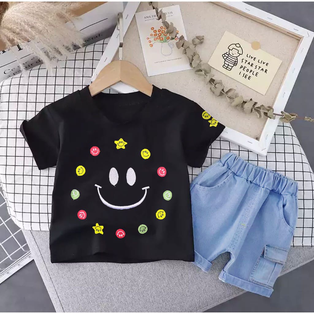SETELAN ANAK BAJU ANAK SMILE 1-5 TAHUN BAHAN BAJU COMBAD 30S CELANA DENIM PRINTING ADEM NYAMAN DI PAKAI SI BUAH HATI BISA UNTUK ANAK LAKI LAKI DAN PEREMPUAN REAL PICT SESUAI GAMBAR YA MOMS